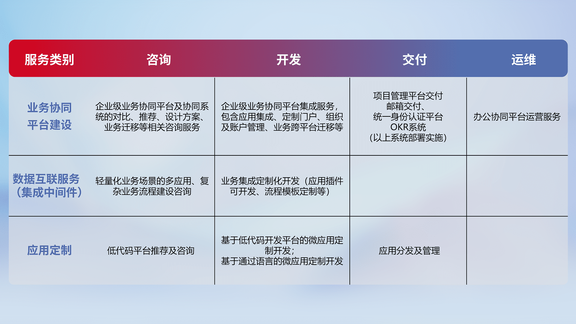 针对钉钉、、企微、、、IDaas等平台级产品提供产品的规划、、方案、、、交付、、定制化开发等服务,,,,实现如统一协同办公、、智能客户服务、、、混合会议管理、、、智能数据查询、、、、等业务场景,,实现数字化转型。。。。